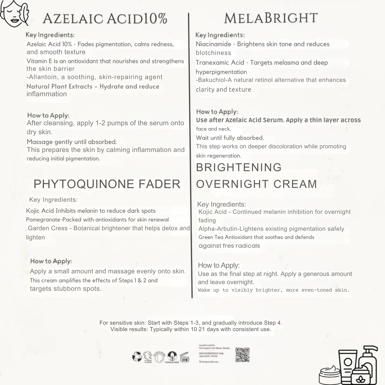DermagenixLab’s brightening system combines medical-grade actives with elegant, non-irritating delivery. What impressed me most is the synergy between the Melanic Acid and Phyto quinone Fader — they address both pigment formation and cellular turnover. It’s a well-designed protocol for anyone serious about long-term radiance.
